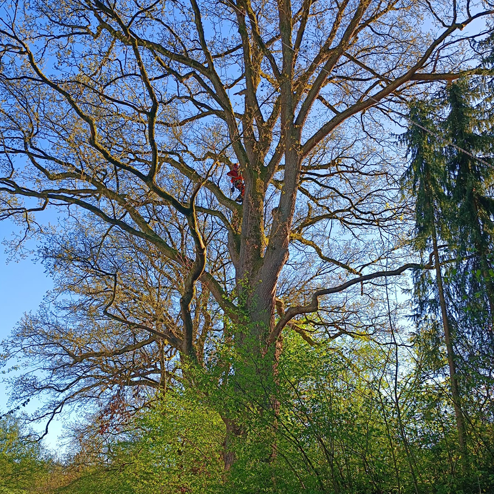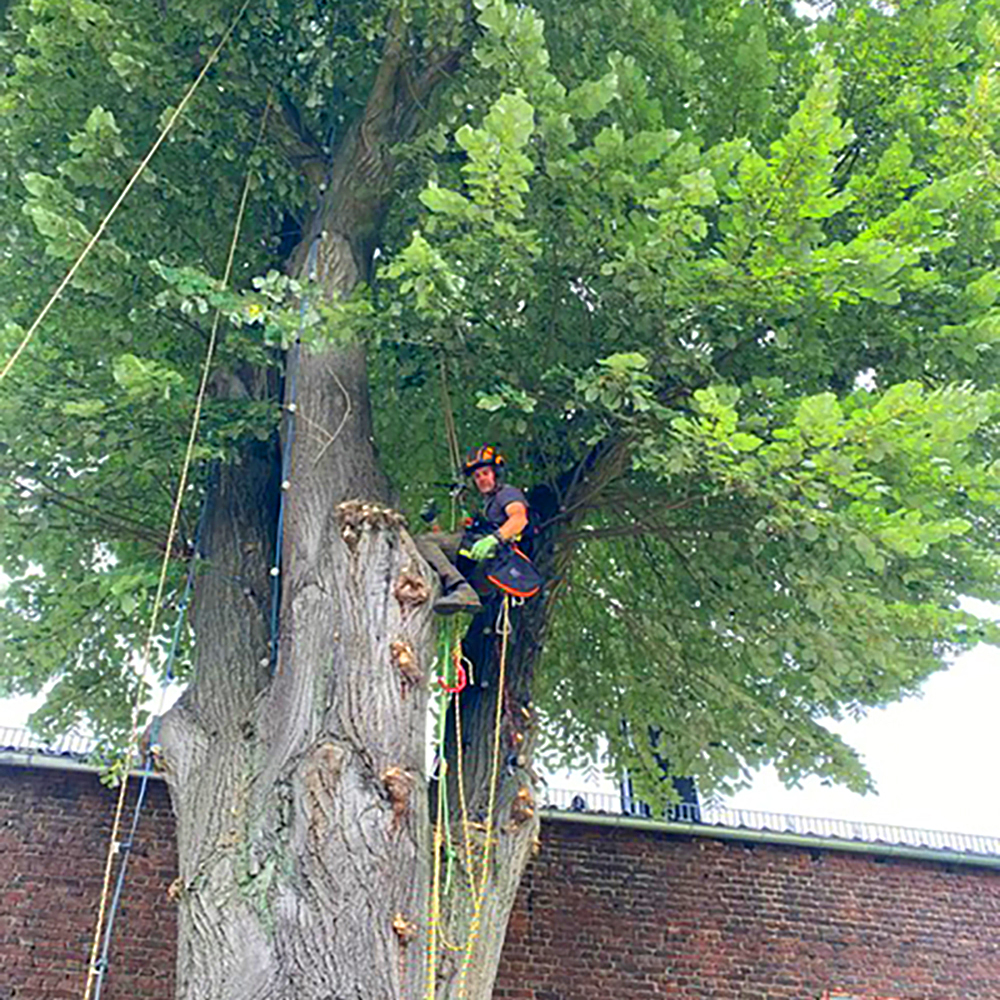 In manchen Fällen ist eine Kronensicherung notwendig – zum Beispiel, wenn schwere oder beschädigte Äste bruchgefährdet sind. Spezielle Gurte oder Seilsysteme helfen dann, die Krone zu stabilisieren und den Baum langfristig zu erhalten.