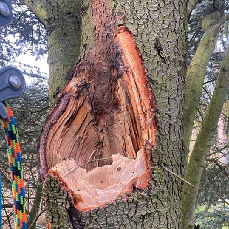 An der sogenannten Ausbruchstelle – also dort, wo ein Ast oder Kronenteil herausgerissen wurde – entstehen oft große Wunden im Holz. Diese müssen fachgerecht versorgt werden: lose Rindenteile werden entfernt, die Wunde wird geglättet, um Fäulnis vorzubeugen. In manchen Fällen hilft auch eine Kronensicherung, um den restlichen Baum zu stabilisieren.
